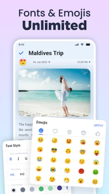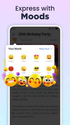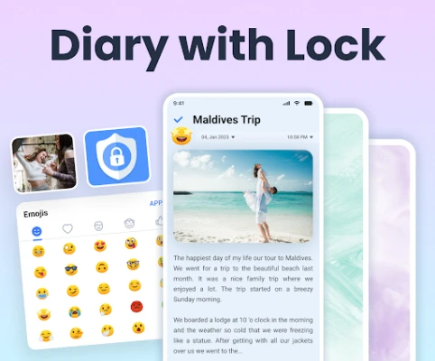 Med Min dagbog er dine fortrolige tanker sikret gennem robust beskyttelse. Vælg mellem en PIN-kode, fingeraftrykslås og endda et ekstra sikkerhedsspørgsmål, der danner et uigennemtrængeligt skjold omkring dine personlige optegnelser. Men sikkerhed betyder ikke, at du skal gå på kompromis med udtryk. Sød dagbog App tilbyder et væld af tilpasningsmuligheder; fra skiftende tidsformater og ugedage til et righoldigt udvalg af baggrunde i solide og gradientfarver. Personliggør din visuelle oplevelse med en imponerende samling af temaer og emoji-stemningsstile, der virkelig lader din personlighed skinne igennem.